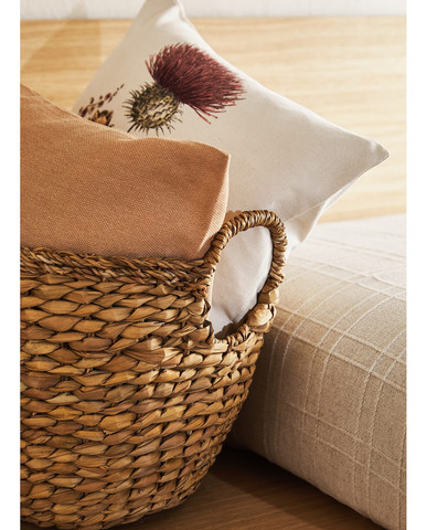 Panier rond XL en feuilles de palmier, h 50 cm, 44 € Le Joli Shop / Corbeille cache-pot avec des anses, h 30cm, 22,99 € ZARA HOME